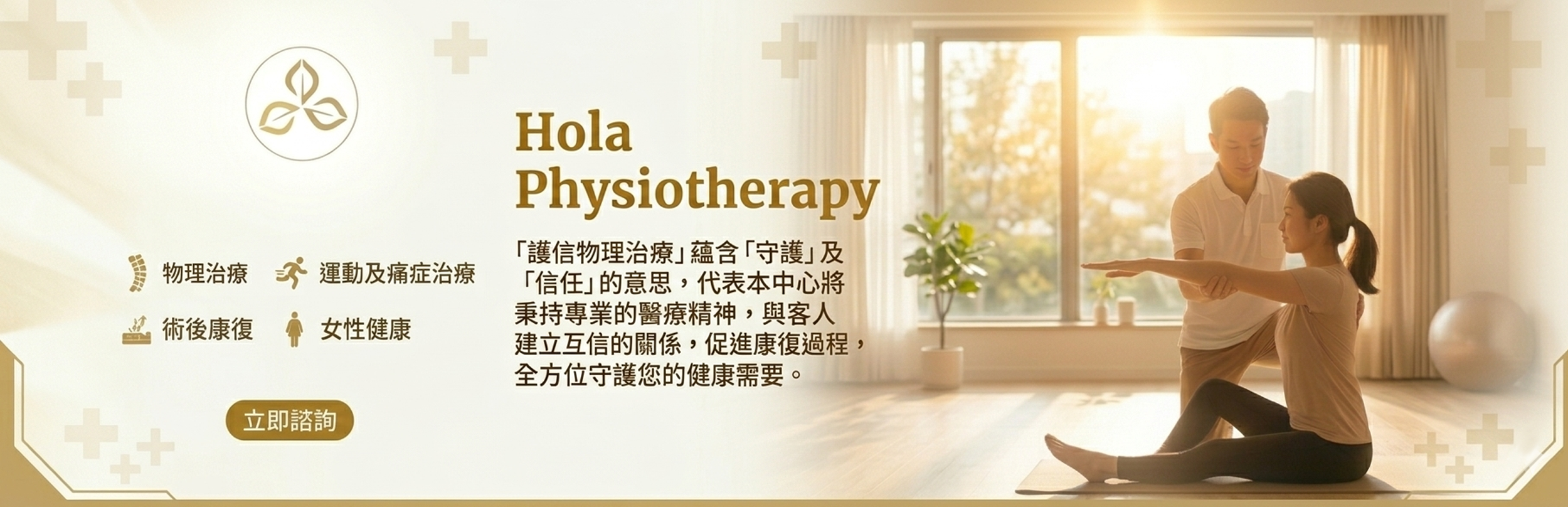 「護信物理治療」蘊含「守護」及「信任」的意思,代表本中心將秉持專業的醫療精神,與客人建立互信的關係,促進康復過程,全方位守護您的健康需要。 「護信物理治療」服務範疇主要包括 物理治療、運動及痛症治療、術後康復及女性健康。